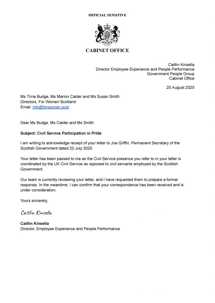 Following the High Court ruling against Northumbria Police on 16 July 2025, which said participation in Pride marches breached the force’s impartiality duties, we sent the following letter to the Permanent Secretary for Scotland to raise similar concerns about a breach of the civil service duty of impartiality. Representatives of the civil service chose to march in Glasgow Pride just a few days after the judgment was handed down, despite Pride organisers making it clear that only those who supported its protest against the FWS Supreme Court ruling were welcome to attend.